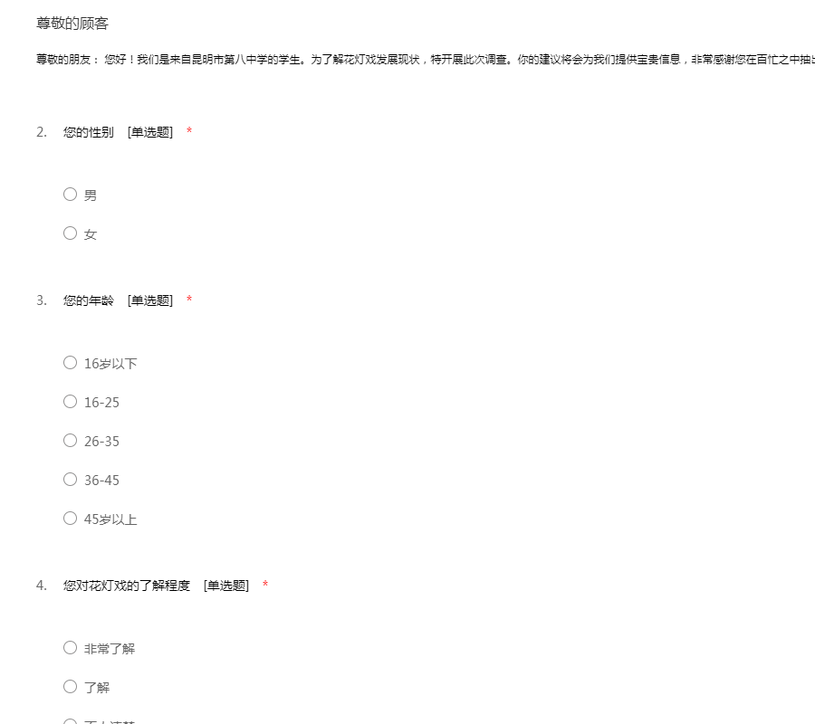 尊敬的朋友: 您好!我们是来自昆明市第八中学的学生。为了解花灯戏发展现状,特开展此次调查。你的建议将会为我们提供宝贵信息,非常感谢您在百忙之中抽出时间填写这份调查问卷!