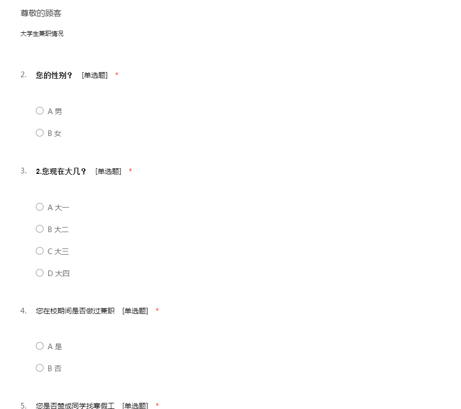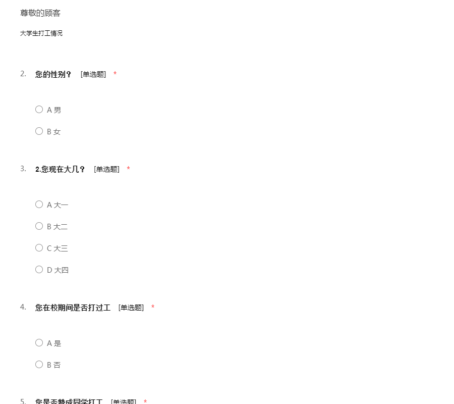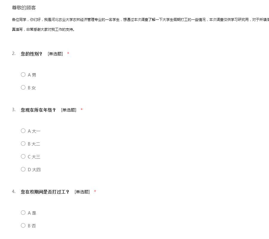 各位同学,你们好,我是河北农业大学农林经济管理专业的一名学生,想通过本次调查了解一下大学生假期打工的一些情况,本次调查仅供学习研究用,对于所填信息绝不外漏,希望大家能根据自己的真实情况认真填写,非常感谢大家对我工作的支持。