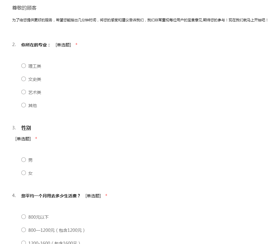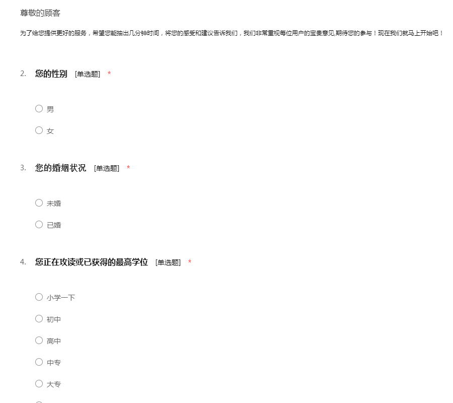 为了给您提供更好的服务,希望您能抽出几分钟时间,将您的感受和建议告诉我们,我们非常重视每位用户的宝贵意见,期待您的参与!现在我们就马上开始吧!