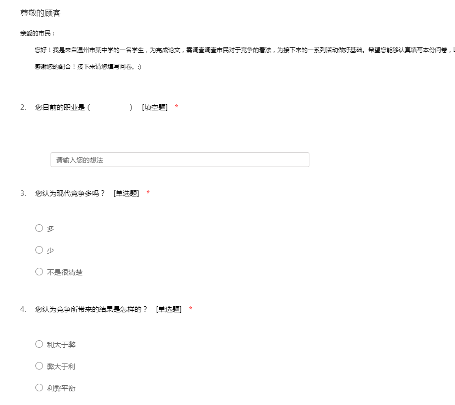 亲爱的市民: 您好!我是来自温州市某中学的一名学生,为完成论文,需调查调查市民对于竞争的看法,为接下来的一系列活动做好基础。希望您能够认真填写本份问卷,以方便本人进行相关的调查研究。 感谢您的配合!接下来请您填写问卷。:)