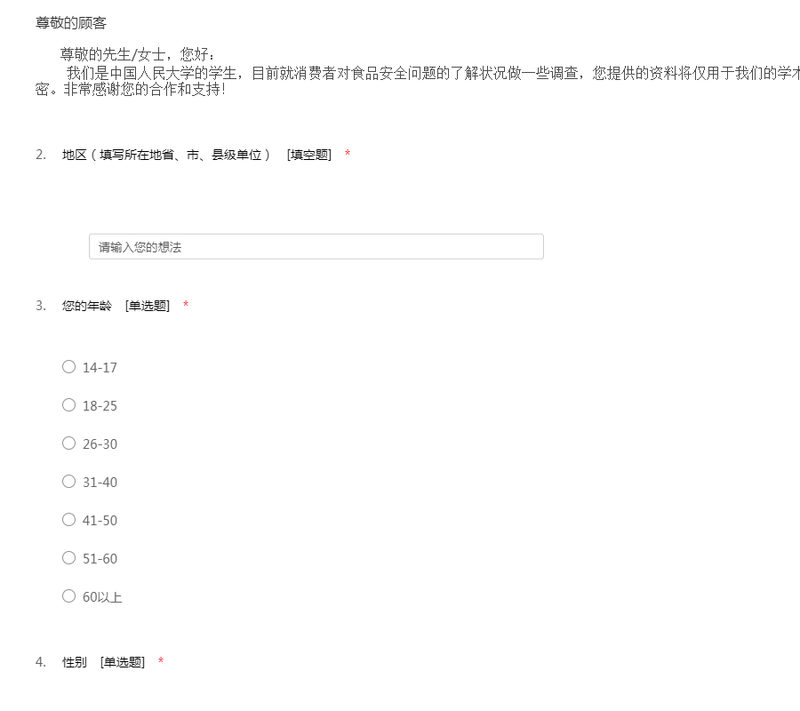 尊敬的先生/女士,您好: 我们是中国人民大学的学生,目前就消费者对食品安全问题的了解状况做一些调查,您提供的资料将仅用于我们的学术研究,我们保证对您的资料予以保密。非常感谢您的合作和支持!