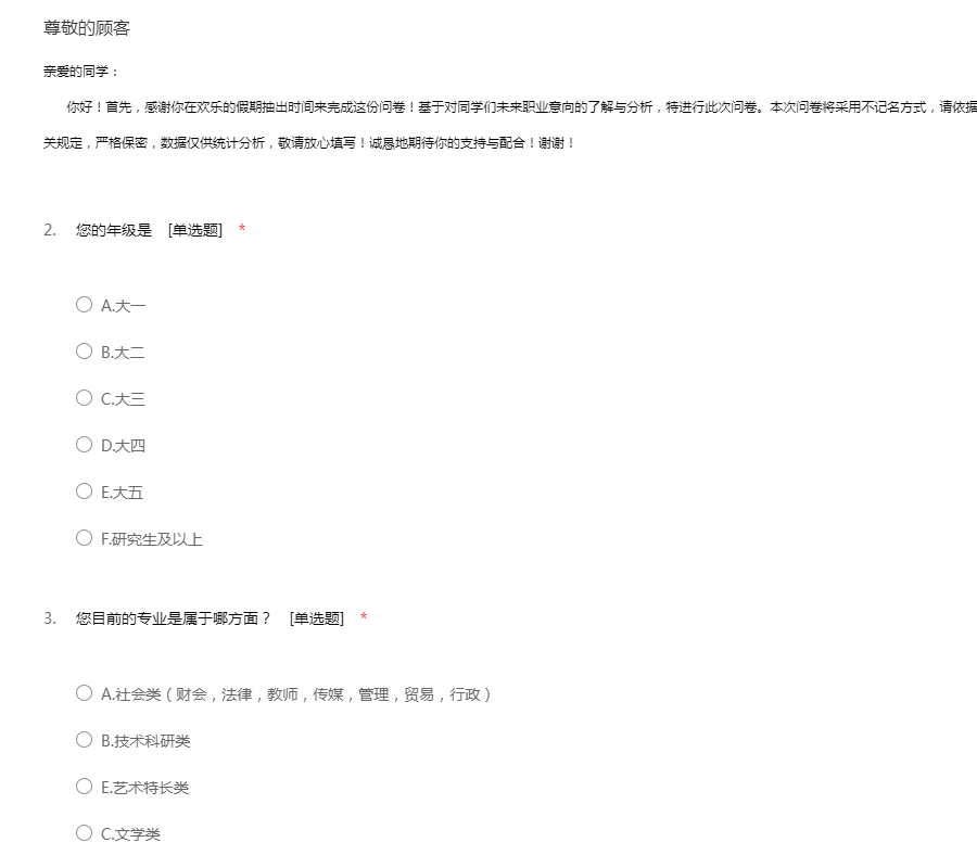亲爱的同学: 你好!首先,感谢你在欢乐的假期抽出时间来完成这份问卷!基于对同学们未来职业意向的了解与分析,特进行此次问卷。本次问卷将采用不记名方式,请依据自身实际进行选择,我们将按照《统计法》的相关规定,严格保密,数据仅供统计分析,敬请放心填写!诚恳地期待你的支持与配合!谢谢!