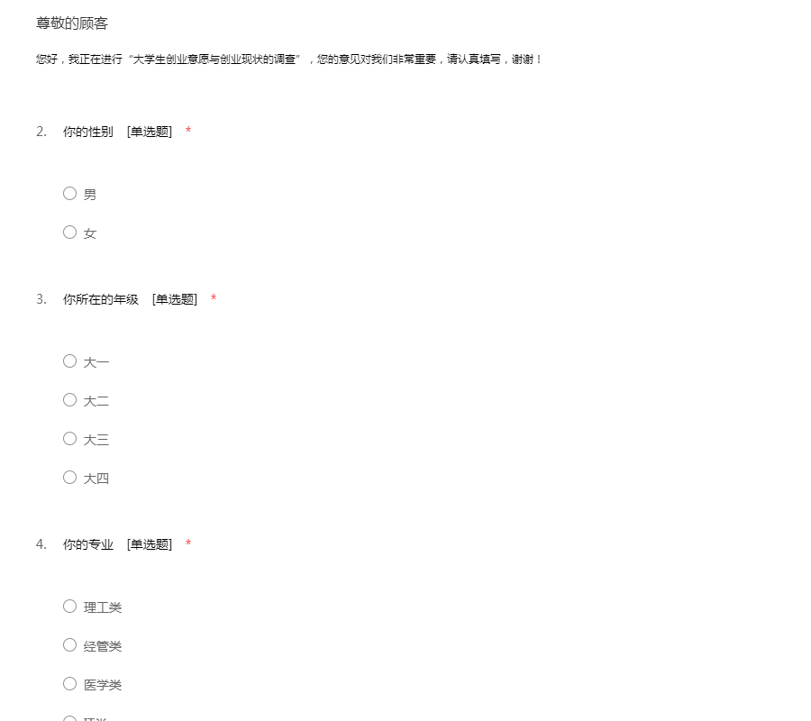 您好,我正在进行“大学生创业意愿与创业现状的调查”,您的意见对我们非常重要,请认真填写,谢谢!