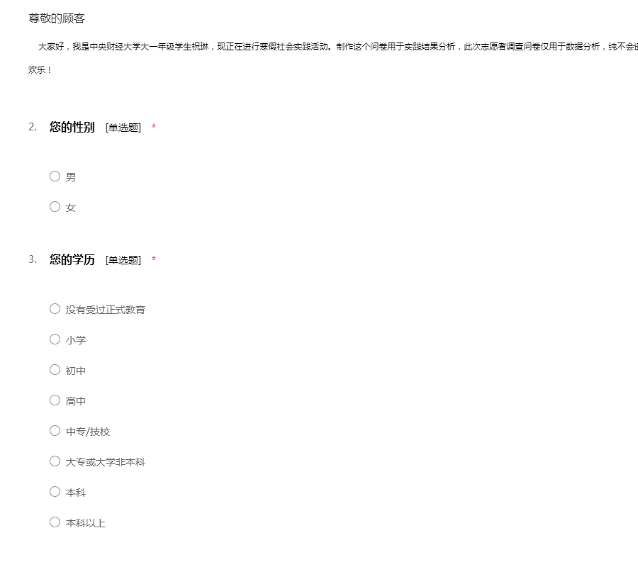 大家好,我是中央财经大学大一年级学生祝琳,现正在进行寒假社会实践活动。制作这个问卷用于实践结果分析,此次志愿者调查问卷仅用于数据分析,纯不会透露大家的隐私。最后,祝大家新年愉快,阖家欢乐!