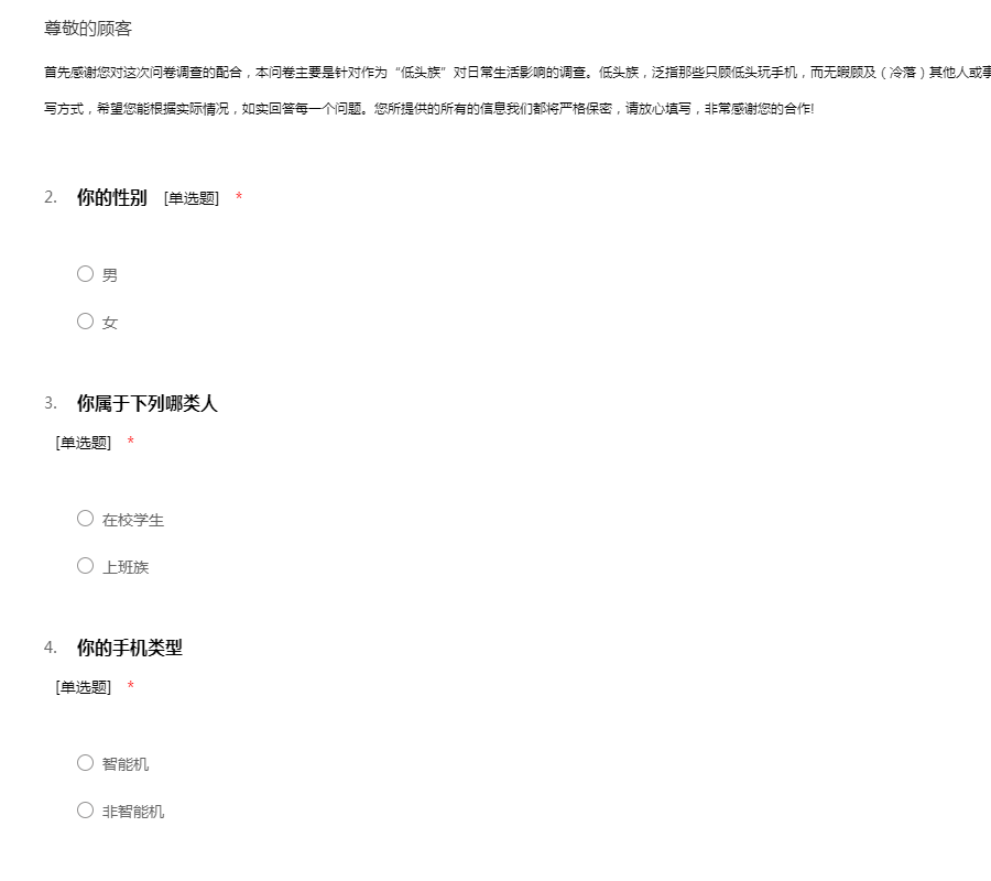 首先感谢您对这次问卷调查的配合,本问卷主要是针对作为“低头族”对日常生活影响的调查。低头族,泛指那些只顾低头玩手机,而无暇顾及(冷落)其他人或事物的一群人或一种社会现象。此问卷采取匿名填写方式,希望您能根据实际情况,如实回答每一个问题。您所提供的所有的信息我们都将严格保密,请放心填写,非常感谢您的合作!