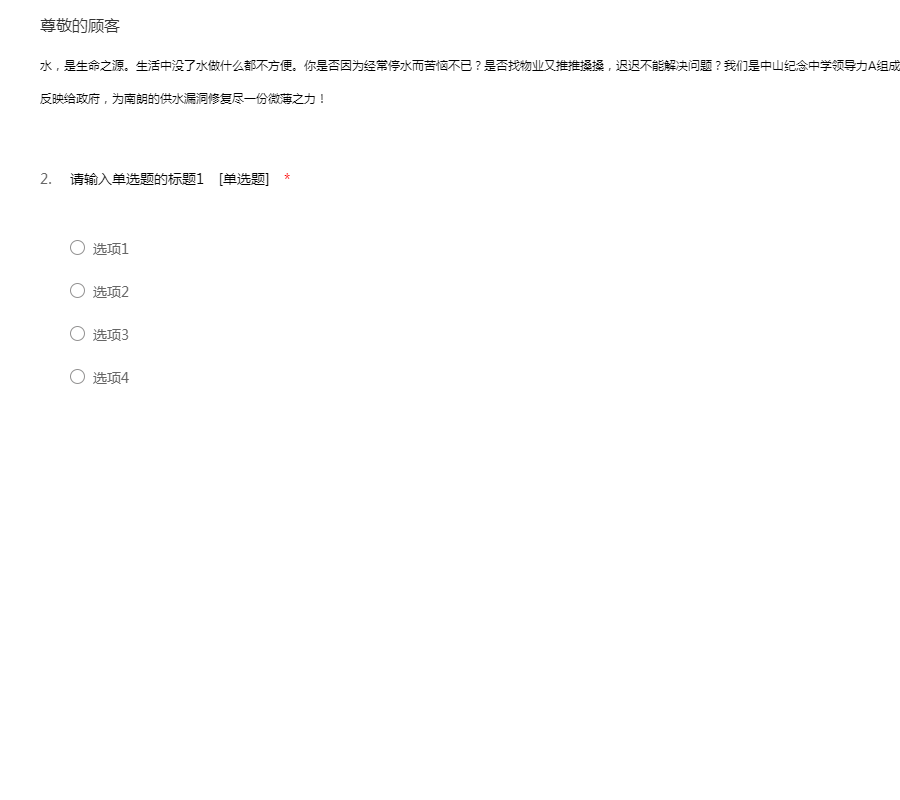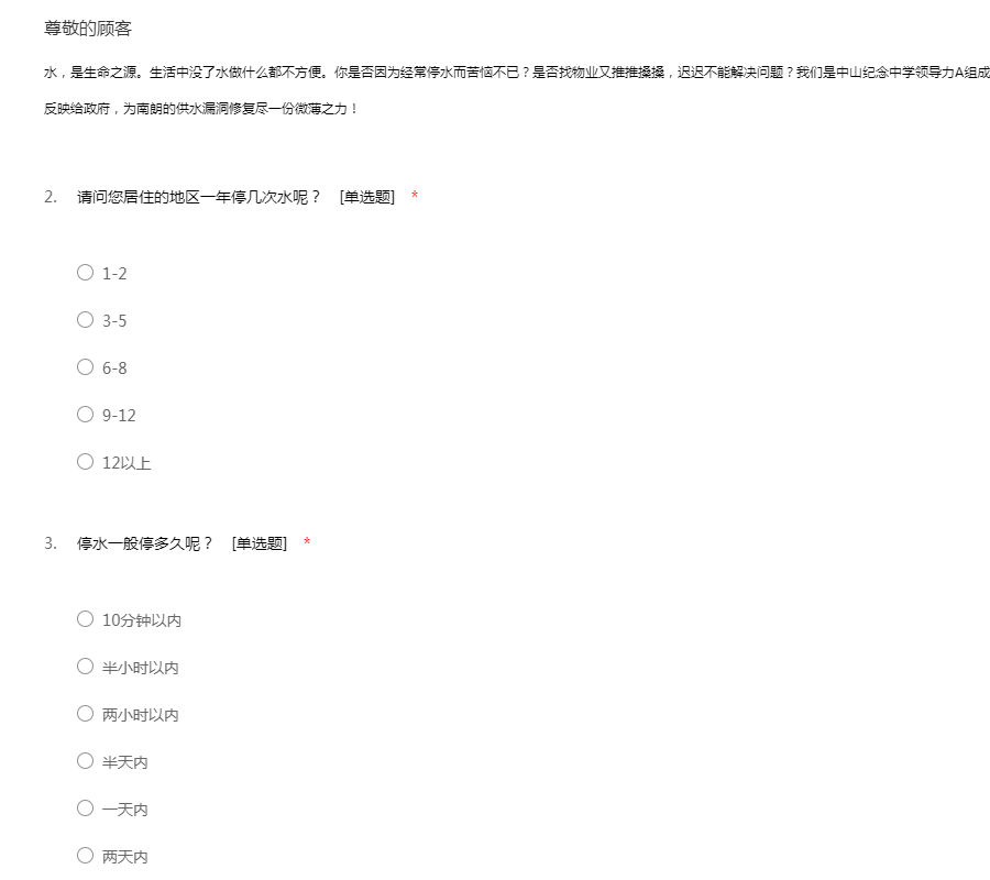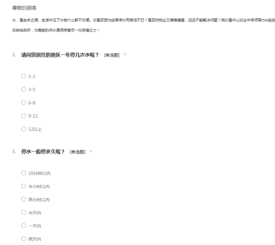 水,是生命之源。生活中没了水做什么都不方便。你是否因为经常停水而苦恼不已?是否找物业又推推搡搡,迟迟不能解决问题?我们是中山纪念中学领导力A组成员,诚心邀请您完成一张调查问卷,并会将结果反映给政府,为南朗的供水漏洞修复尽一份微薄之力!