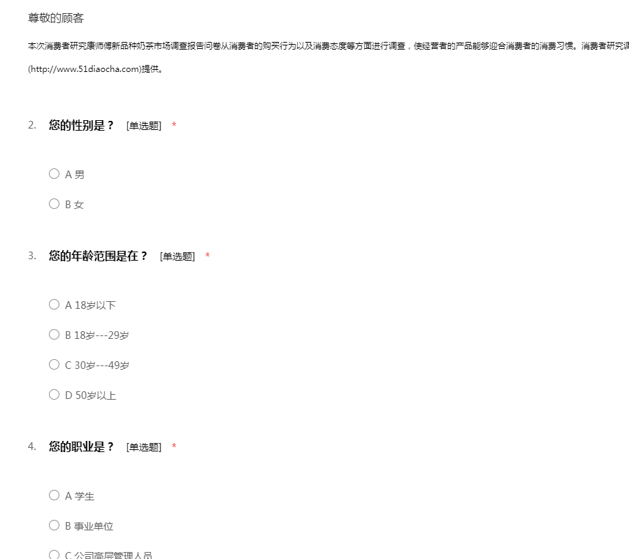 本次消费者研究康师傅新品种奶茶市场调查报告问卷从消费者的购买行为以及消费态度等方面进行调查,使经营者的产品能够迎合消费者的消费习惯。消费者研究调查问卷模板是由我要调查网(http://www.51diaocha.com)提供。