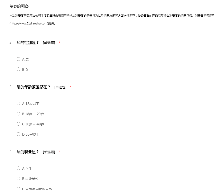 本次消费者研究宝洁公司生活家品牌市场调查问卷从消费者的购买行为以及消费态度等方面进行调查,使经营者的产品能够迎合消费者的消费习惯。消费者研究调查问卷模板是由我要调查网(http://www.51diaocha.com)提供。