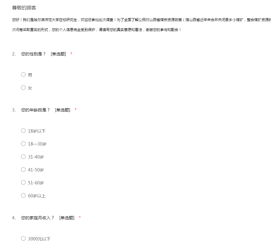 您好!我们是哈尔滨师范大学在校研究生,欢迎您参加此次调查!为了全面了解公民对山西省煤炭资源政策(指山西省近年来合并关闭县乡小煤矿,整合煤矿资源的政策)的满意程度,我们进行本次问卷调查。本次问卷采取匿名的形式,您的个人信息完全受到保护,请填写您的真实意愿和看法,谢谢您的参与和配合!