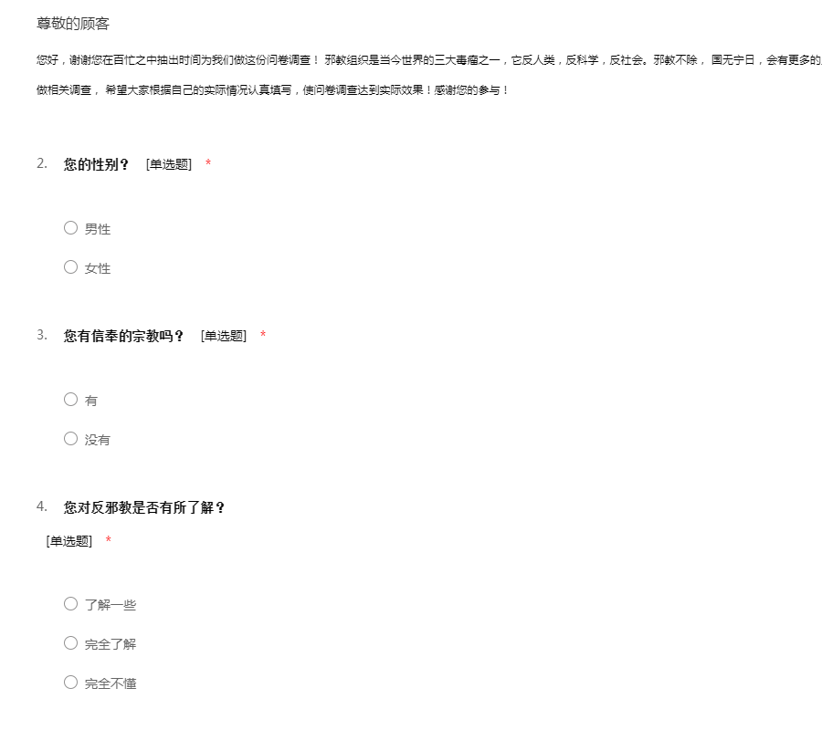 您好,谢谢您在百忙之中抽出时间为我们做这份问卷调查! 邪教组织是当今世界的三大毒瘤之一,它反人类,反科学,反社会。邪教不除, 国无宁日,会有更多的人受到邪教的迫害。为此,我们特制作了此问卷做相关调查, 希望大家根据自己的实际情况认真填写,使问卷调查达到实际效果!感谢您的参与!
