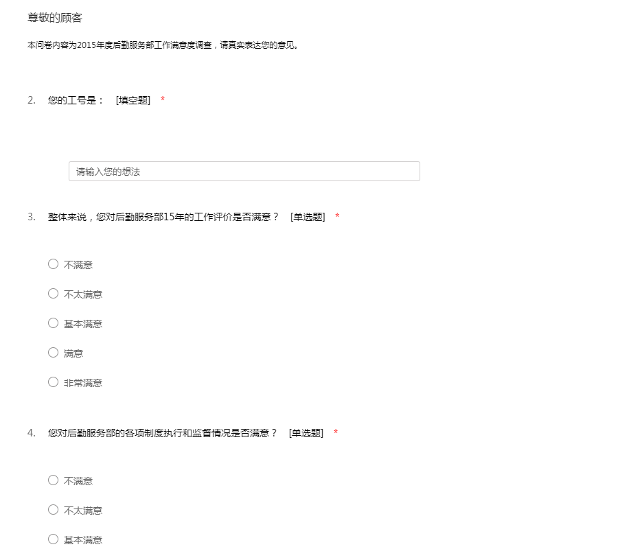 本问卷内容为2015年度后勤服务部工作满意度调查,请真实表达您的意见。