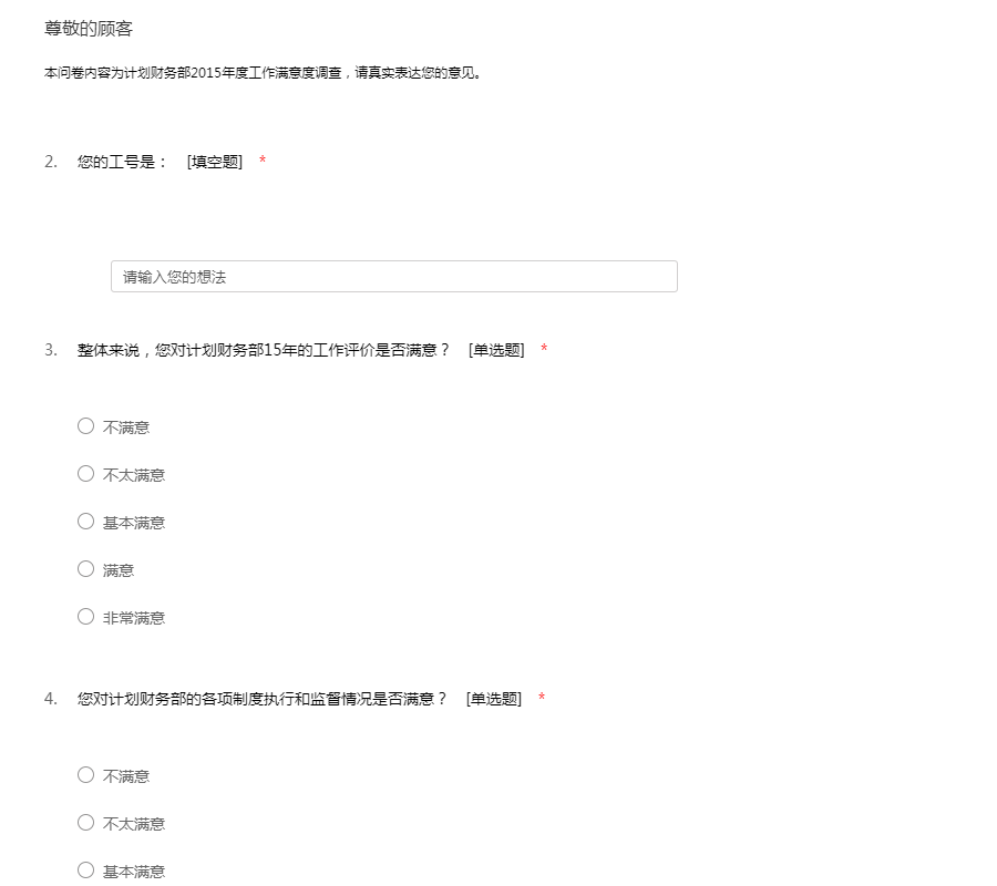 本问卷内容为计划财务部2015年度工作满意度调查,请真实表达您的意见。