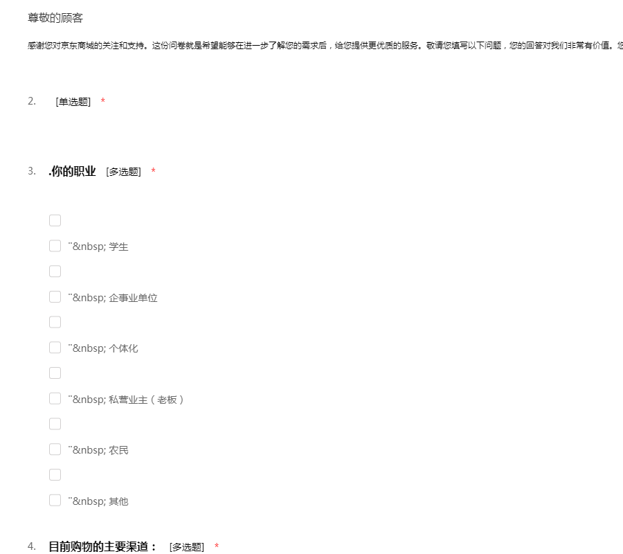 感谢您对京东商城的关注和支持。这份问卷就是希望能够在进一步了解您的需求后,给您提供更优质的服务。敬请您填写以下问题,您的回答对我们非常有价值。您的资料我们会给予保密,敬请放心。