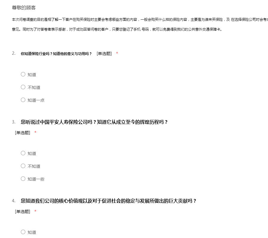 本次问卷调查的目的是相了解一下客户在购买保险时主要会考虑哪些方面的内容,一般会购买什么样的保险内容,主要是为谁来买保险,及 在选择保险公司时会考虑的一些因素等。为我们的保险营销提供建议与意见。同时为了对答卷者表示感谢,对于成功回答问卷的客户,只要您登记了手机 号码,就可以免费得到我们的公共意外交通保障卡。