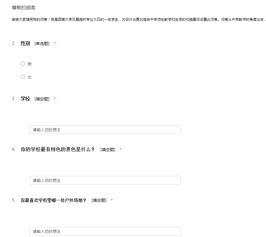 谢谢大家填写我的问卷!我是西南大学风景园林专业大四的一名学生,为设计出更加适合中学师生教学和生活的校园景观设置此问卷。问卷从中学教师的角度出发,调查教师对中学校园户外空间的需求。