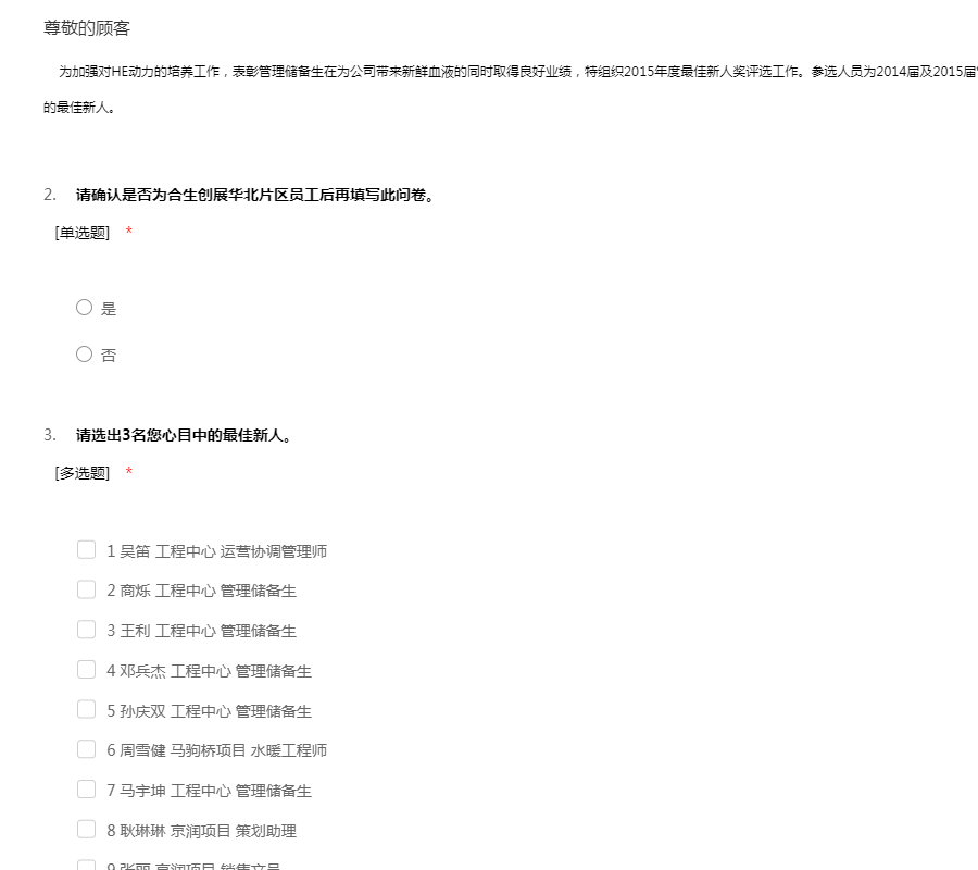 为加强对HE动力的培养工作,表彰管理储备生在为公司带来新鲜血液的同时取得良好业绩,特组织2015年度最佳新人奖评选工作。参选人员为2014届及2015届管理储备生共计38名,请从中选出3名您心目中的最佳新人。