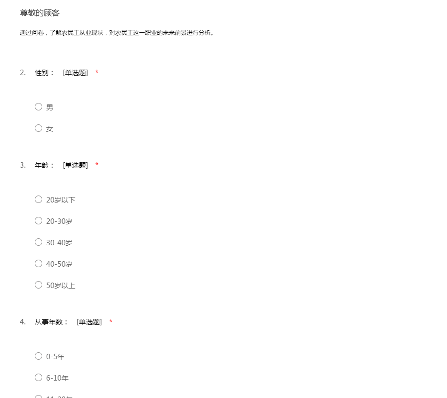 通过问卷,了解农民工从业现状,对农民工这一职业的未来前景进行分析。