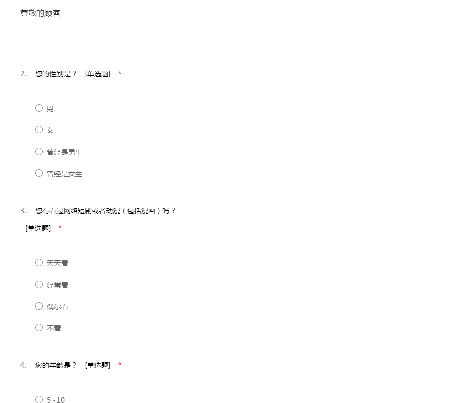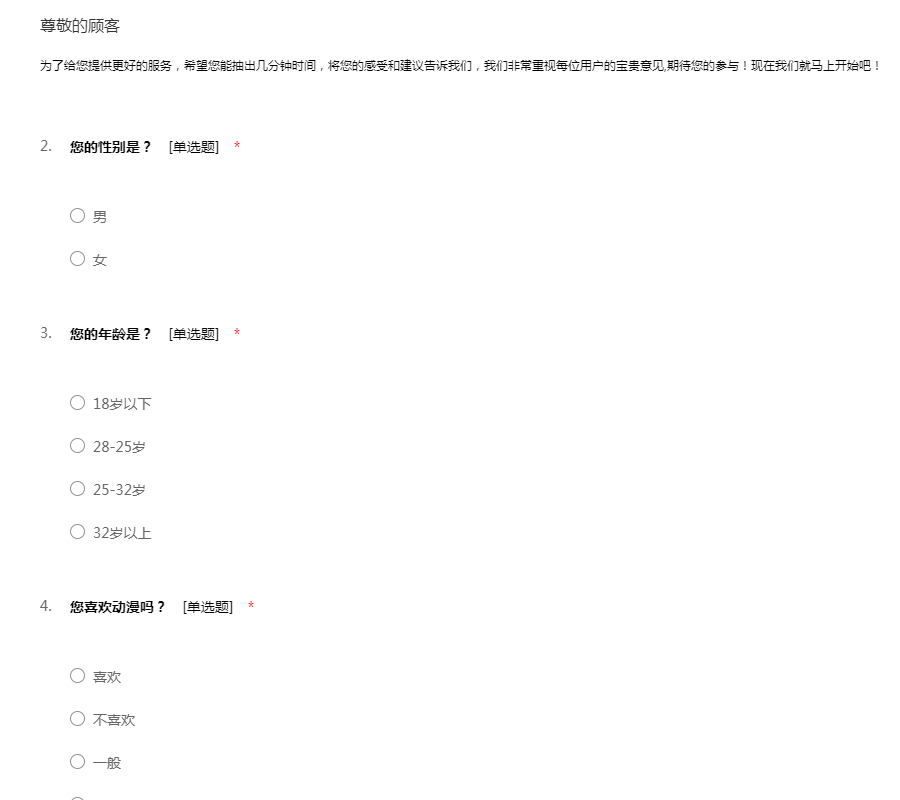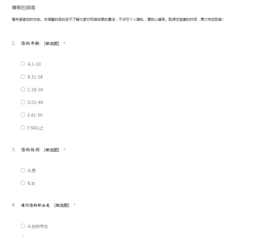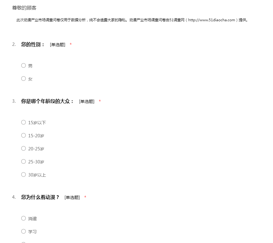 此次动漫产业市场调查问卷仅用于数据分析,纯不会透露大家的隐私。动漫产业市场调查问卷由51调查网(http://www.51diaocha.com)提供。