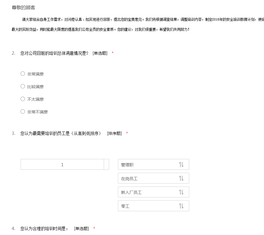 请大家结合自身工作需求,对问卷认真、如实地进行回答,提出您的宝贵意见。我们将根据调查结果,调整培训内容,制定2016年的安全培训教育计划,使培训内容能与实际工作相结合,使得培训能够获得最大的实际效益,同时能最大限度的提高我们公司全员的安全素质。您的建议,对我们很重要,希望我们共同努力!