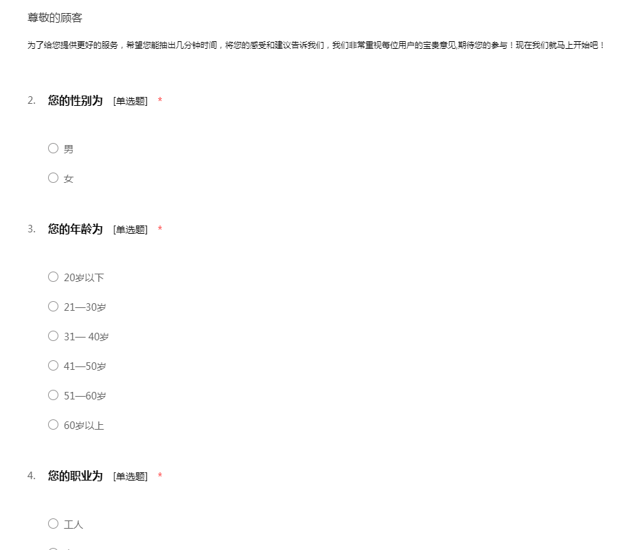 为了给您提供更好的服务,希望您能抽出几分钟时间,将您的感受和建议告诉我们,我们非常重视每位用户的宝贵意见,期待您的参与!现在我们就马上开始吧!