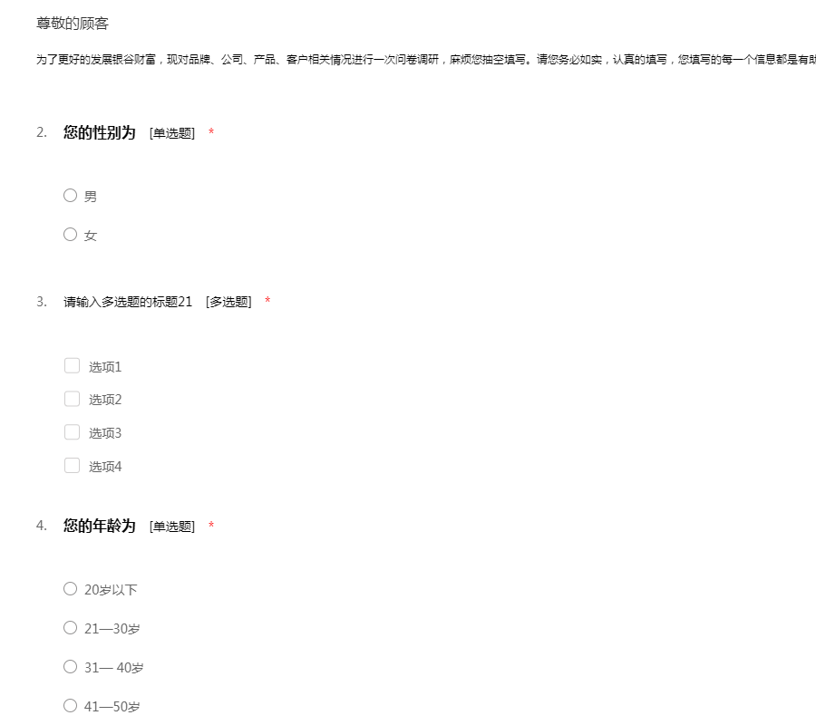 为了更好的发展银谷财富,现对品牌、公司、产品、客户相关情况进行一次问卷调研,麻烦您抽空填写。请您务必如实,认真的填写,您填写的每一个信息都是有助于企业长期的发展,谢谢!