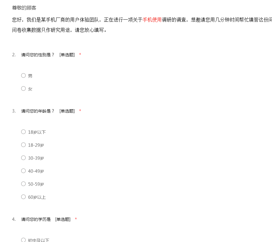 您好,我们是某手机厂商的用户体验团队,正在进行一项关于手机使用调研的调查,想邀请您用几分钟时间帮忙填答这份问卷。问卷收集数据只作研究用途,请您放心填写。