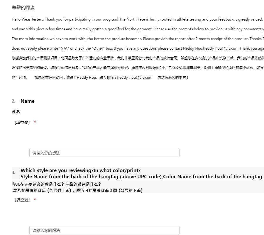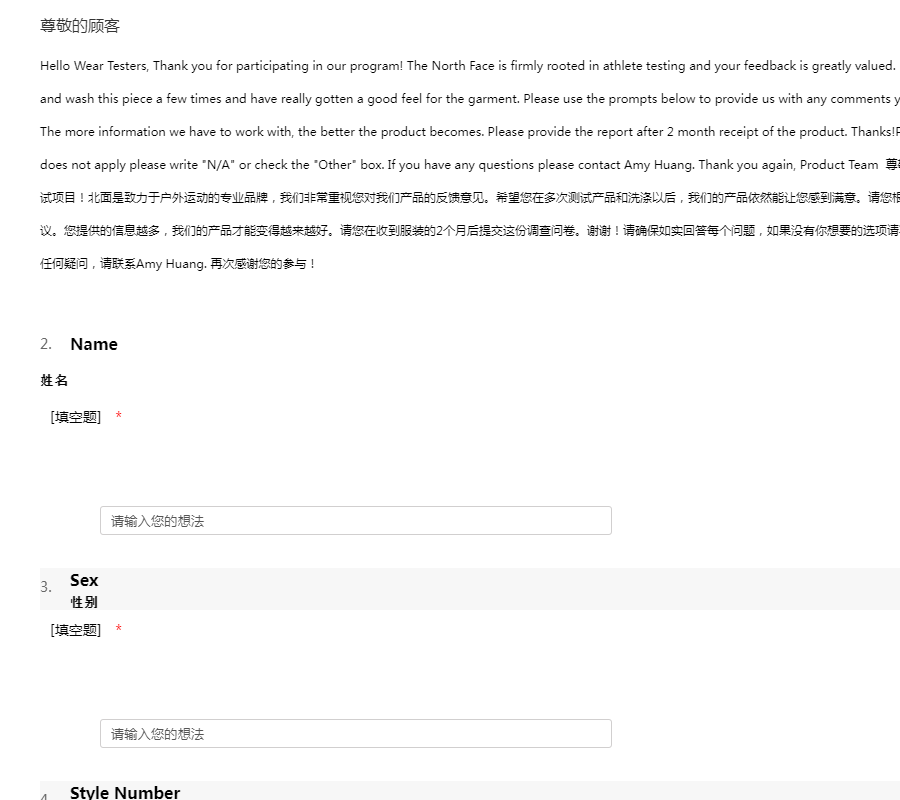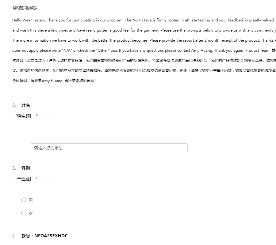 Hello Wear Testers, Thank you for participating in our program! The North Face is firmly rooted in athlete testing and your feedback is greatly valued. Hopefully you have had the time to wear and wash this piece a few times and have really gotten a good feel for the garment. Please use the prompts below to provide us with any comments you have. Please be honest and thorough! The more information we have to work with, the better the product becomes. Please provide the report after 2 month receipt of the product. Thanks!Please be sure to answer every question. If it does not apply please write "N/A" or check the "Other" box. If you have any questions please contact Amy Huang. Thank you again, Product Team 尊敬的试穿者: 非常感谢您能参加我们的产品测试项目!北面是致力于户外运动的专业品牌,我们非常重视您对我们产品的反馈意见。希望您在多次测试产品和洗涤以后,我们的产品依然能让您感到满意。请您根据下面各项的提示如实地给我们提出意见和建议。您提供的信息越多,我们的产品才能变得越来越好。请您在收到服装的2个月后提交这份调查问卷。谢谢!请确保如实回答每个问题,如果没有你想要的选项请写上"N/A"或者勾选“其他”选项。 如果您有任何疑问,请联系Amy Huang. 再次感谢您的参与!