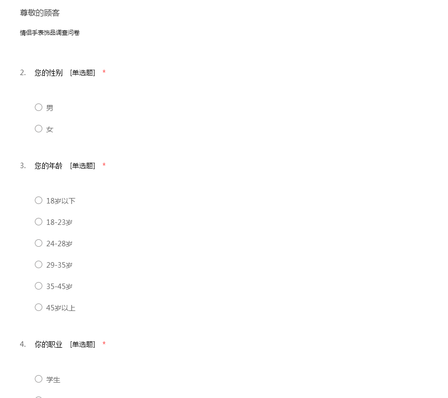 您好!为了更好地了解在校大学生的饰品市场,我们做了此次调查问卷,请耐心的回答下列问题,希望得到您的支持,谢谢!