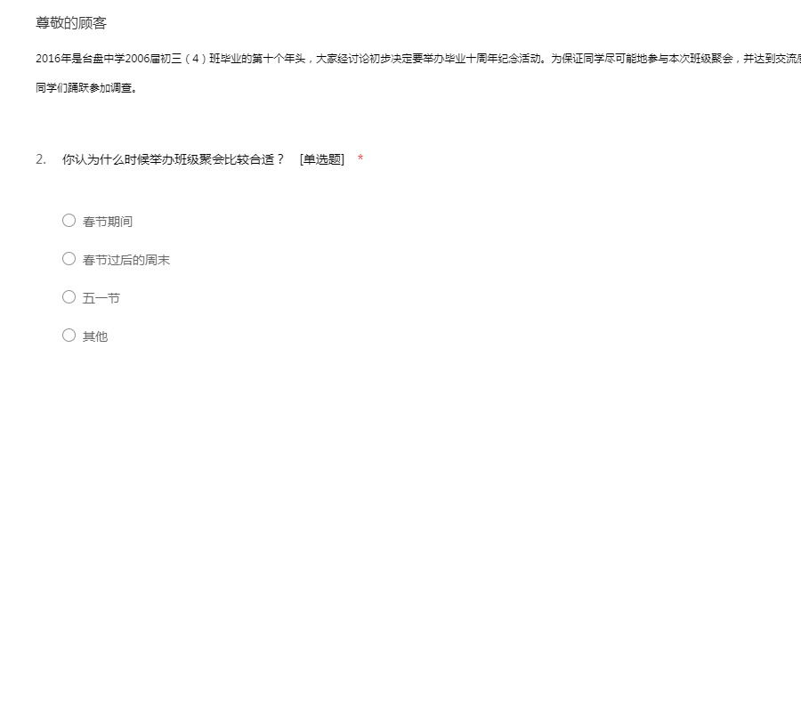 2016年是台盘中学2006届初三(4)班毕业的第十个年头,大家经讨论初步决定要举办毕业十周年纪念活动。为保证同学尽可能地参与本次班级聚会,并达到交流感情、增进友谊的效果,特制作此调查问卷,请同学们踊跃参加调查。