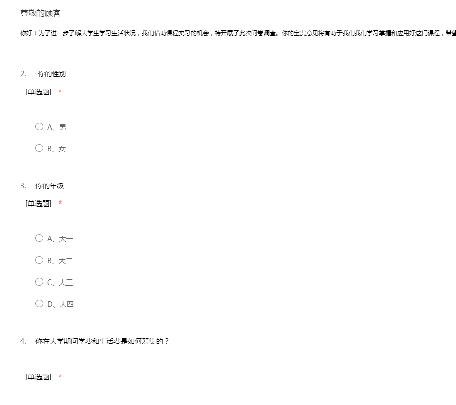 你好!为了进一步了解大学生学习生活状况,我们借助课程实习的机会,特开展了此次问卷调查。你的宝贵意见将有助于我们我们学习掌握和应用好这门课程,希望大家多多支持。