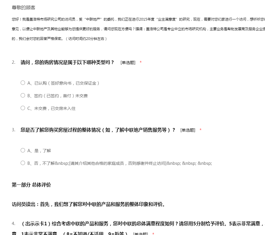 您好!我是盖洛特市场研究公司的访问员,受“中联地产”的委托,我们正在进行2015年度“业主满意度”的研究,现在,需要对您们家进行一个访问,想听听您们对“中联地产及物业”相关服务方面的评价和意见,以便让中联地产及其物业能够为您提供更好的服务,请问您现在方便吗?强调:盖洛特公司是专业中立的市场研究机构,主要业务是帮助发展商及服务企业提升客户服务水平。 我们的访问没有任何推销目的,我们会对您的回答严格保密。(访问时间约20分钟左右)