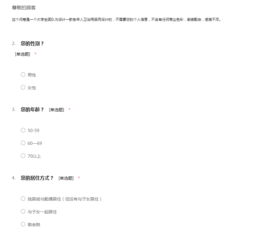 这个问卷是一个大学生团队为设计一款老年人卫浴用品而设计的,不需要您的个人信息,不含有任何商业色彩,谢谢配合,感激不尽。