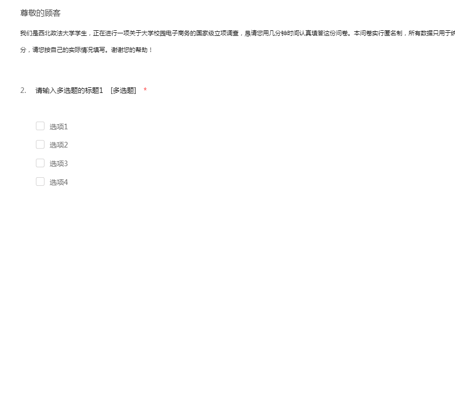 我们是西北政法大学学生,正在进行一项关于大学校园电子商务的国家级立项调查,恳请您用几分钟时间认真填答这份问卷。本问卷实行匿名制,所有数据只用于统计分析, 请您放心填写。题目选项无对错之分,请您按自己的实际情况填写。谢谢您的帮助!