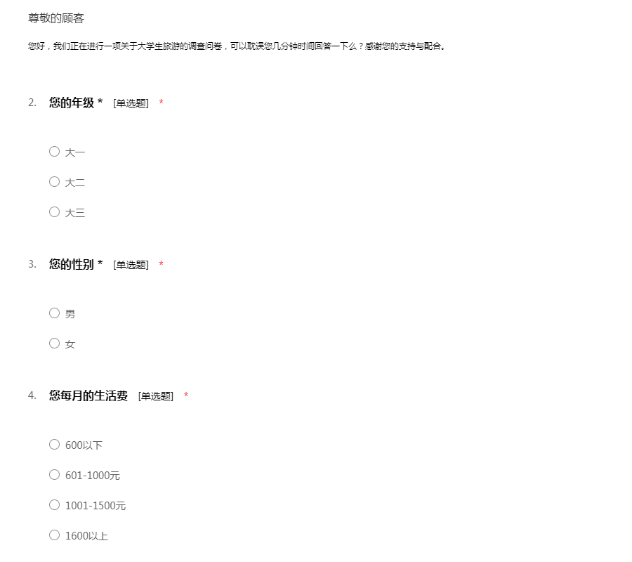您好,我们正在进行一项关于大学生旅游的调查问卷,可以耽误您几分钟时间回答一下么?感谢您的支持与配合。