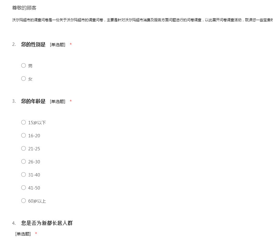 沃尔玛超市的调查问卷是一份关于沃尔玛超市的调查问卷,主要是针对沃尔玛超市消费及服务方面问题进行的问卷调查,以此展开问卷调查活动,耽误您一些宝贵时间,回答关于沃尔玛超市,谢谢您的合作。
