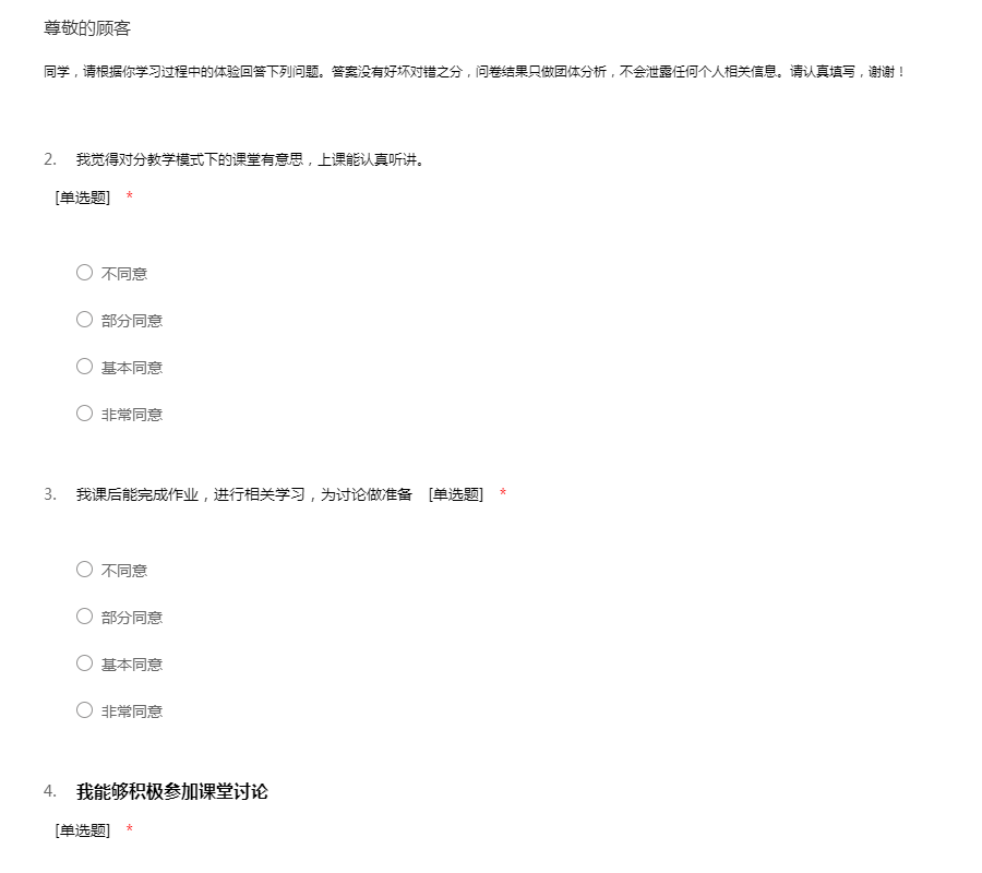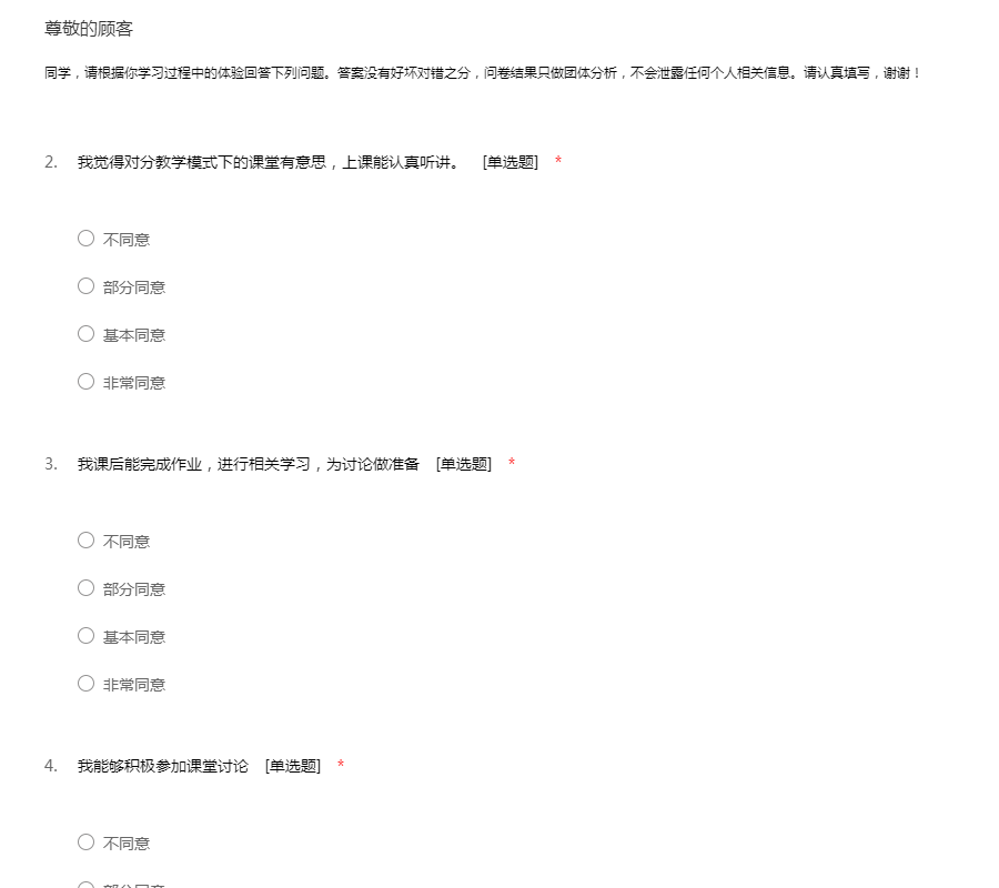 同学,请根据你学习过程中的体验回答下列问题。答案没有好坏对错之分,问卷结果只做团体分析,不会泄露任何个人相关信息。请认真填写,谢谢!