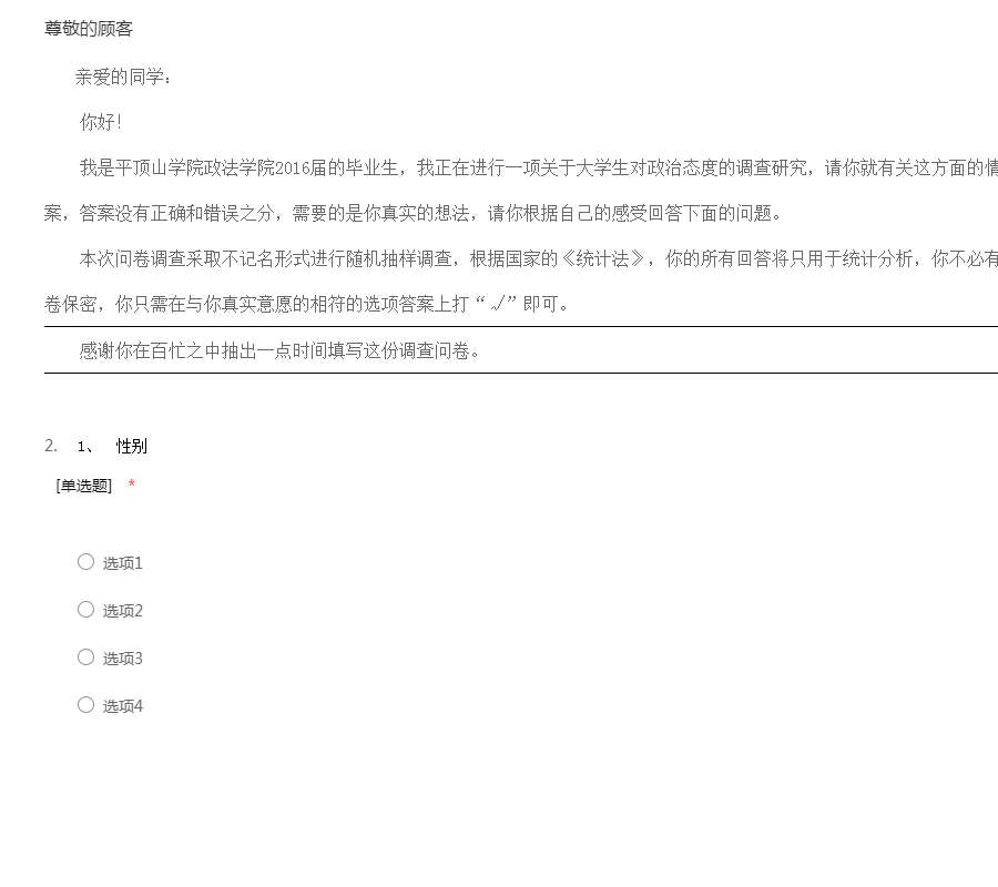 我是平顶山学院政法学院2015届的毕业生,我正在进行一项关于大学生对政治态度的调查研究,请你就有关这方面的情况,勾出下面问题中符合你的答案,答案没有正确和错误之分,需要的是你真实的想法,请你根据自己的感受回答下面的问题。
