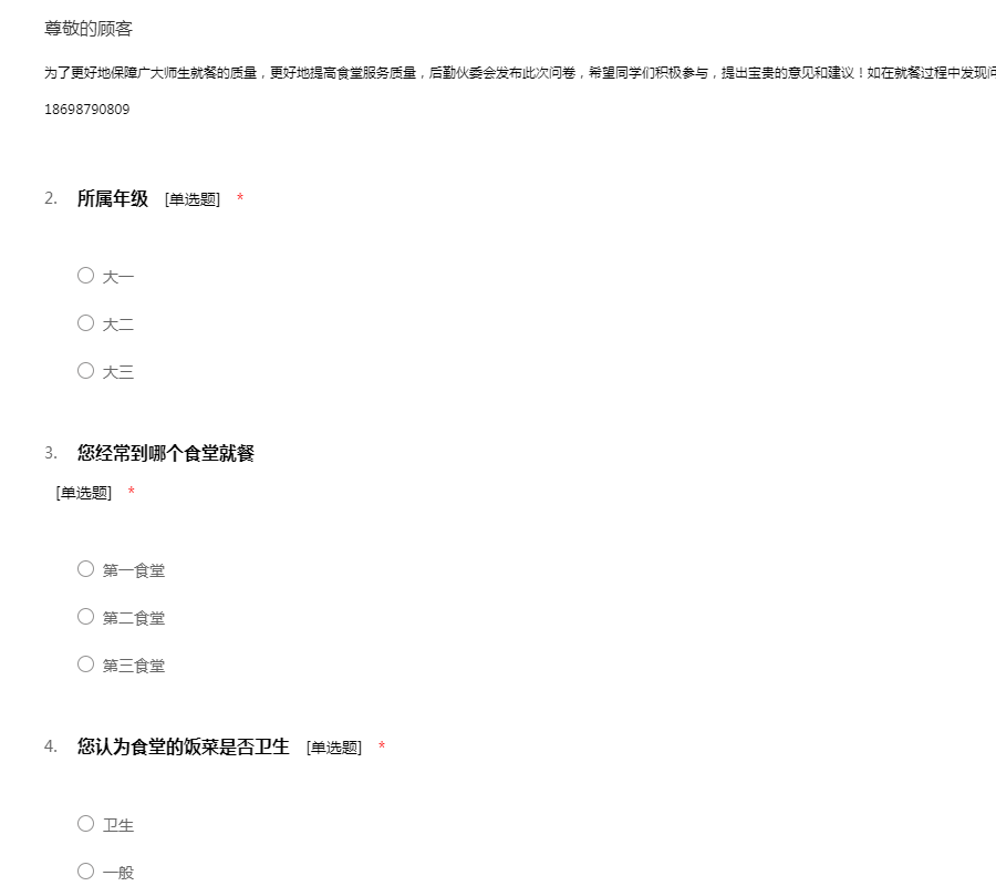 为了更好地保障广大师生就餐的质量,更好地提高食堂服务质量,后勤伙委会发布此次问卷,希望同学们积极参与,提出宝贵的意见和建议!如在就餐过程中发现问题,及时与伙委会联系!联系电话:18698790809