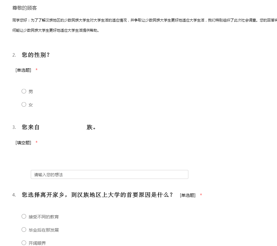 同学您好:为了了解汉族地区的少数民族大学生对大学生活的适应情况,并争取让少数民族大学生更好地适应大学生活,我们特别组织了此次社会调查。您的回答将代表众多和您一样的少数民族大学生,并将对如何能让少数民族大学生更好地适应大学生活提供帮助。