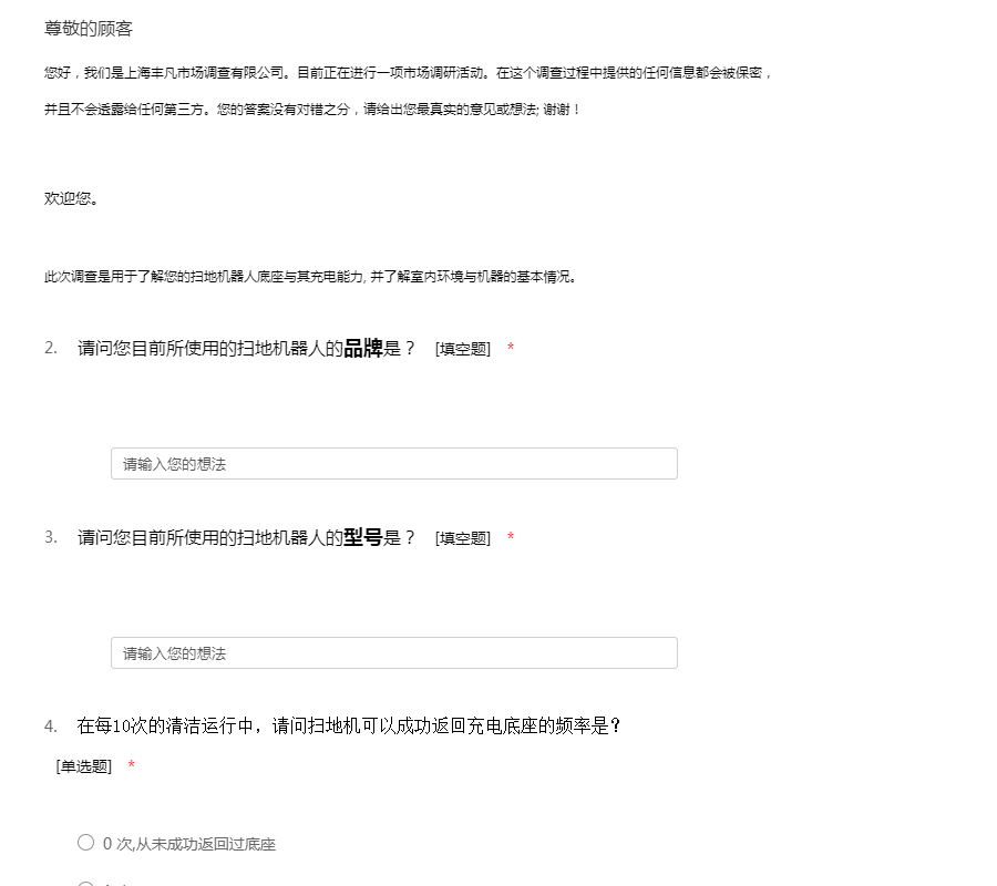 您好,我们是上海丰凡市场调查有限公司。目前正在进行一项市场调研活动。在这个调查过程中提供的任何信息都会被保密, 并且不会透露给任何第三方。您的答案没有对错之分,请给出您最真实的意见或想法; 请用英语作答,谢谢! Please answer the questionnaire in English, Thanks!