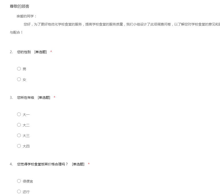 亲爱的同学: 您好,为了更好地优化学校食堂的服务,提高学校食堂的服务质量,我们小组设计了此项调查问卷,以了解您对学校食堂的意见和建议,希望您能如实填写。感谢您的支持与配合!