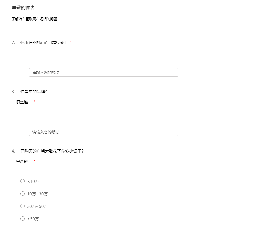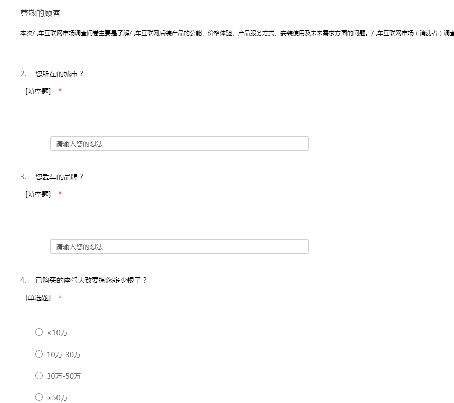 本次汽车互联网市场调查问卷主要是了解汽车互联网后装产品的公能、价格体验、产品服务方式、安装使用及未来需求方面的问题。汽车互联网市场(消费者)调查问卷是由盖洛特市场调查研究公司提供。