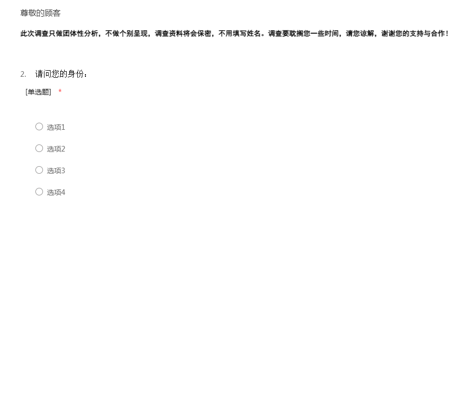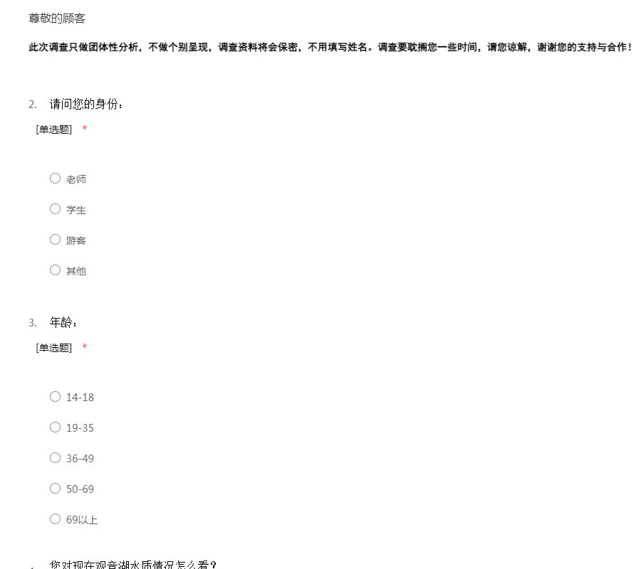 此次调查只做团体性分析,不做个别呈现,调查资料将会保密,不用填写姓名。调查要耽搁您一些时间,请您谅解,谢谢您的支持与合作!
