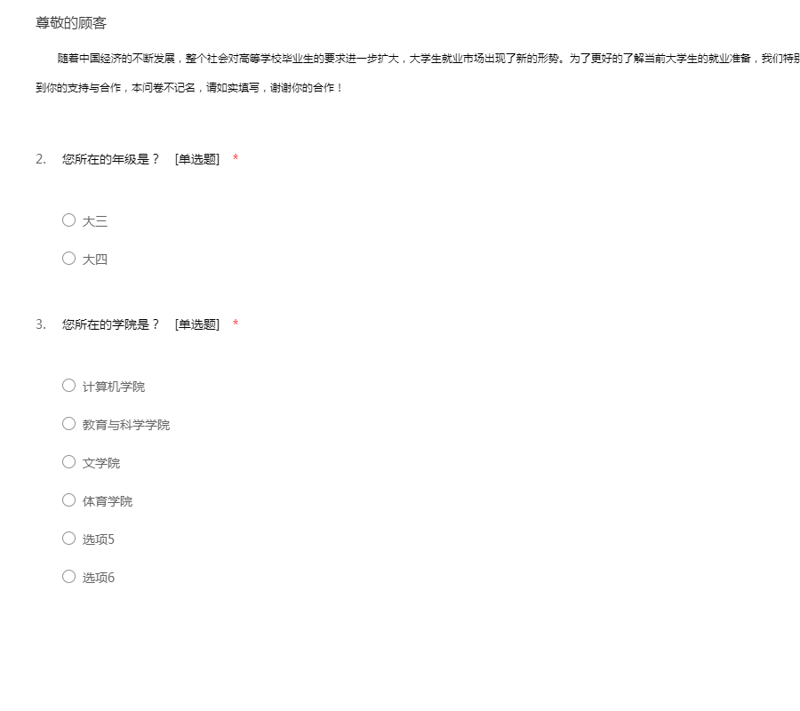 大家好、我们是计算机学院网络1班的学生。为了更好的了解当前大学生的就业准备,我们现在正在做一个关于大学生就业准备的问卷调查,希望能够得到你的支持与合作,本问卷不记名,请如实填写,谢谢您的合作!
