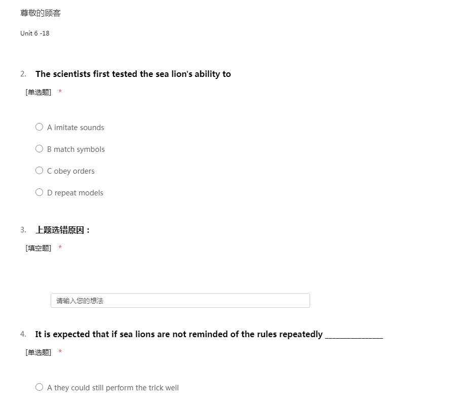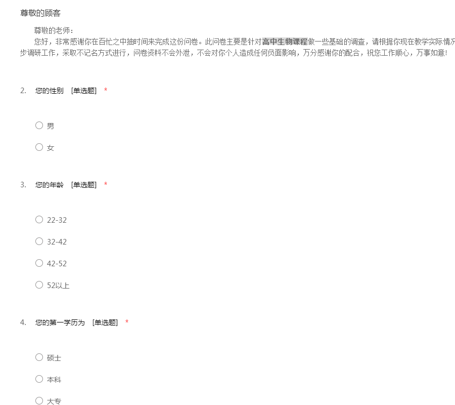 尊敬的老师:您好,非常感谢你在百忙之中抽时间来完成这份问卷。此问卷主要是针对高中生物课程做一些基础的调查,请根据你现在教学实际情况做出适合的选择。此问卷主要用于本人初步调研工作,采取不记名方式进行,问卷资料不会外泄,不会对你个人造成任何负面影响,万分感谢你的配合,祝您工作顺心,万事如意!