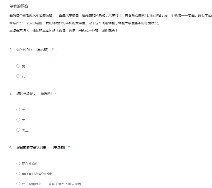 爱情这个古老而又永恒的话题,一直是大学校园一道亮丽的风景线,大学时代,青春萌动使我们开始涉足于另一个领域——恋爱。我们年纪尚轻,涉世太浅,缺乏深入了解和正确判断与评价一个人的经验,我们特地针对本校的大学生,做了这个问卷调查,调查大学生基本的恋爱状况。本调查不记名,请按照真实的想法选择,数据由后台统一处理。谢谢配合!