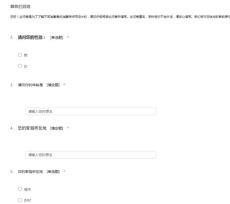 您好!此问卷是为了了解不同消费者的消费特点而设计的,请您仔细阅读此问卷并填写。此问卷匿名,资料绝对不会外泄,请放心填写。我们将对您给与的帮助表示最诚挚的感谢!