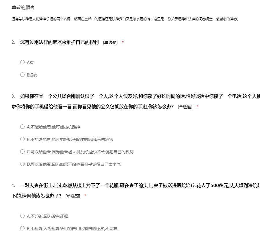道德与法律是人们津津乐道的两个名词,然而在生活中的道德还是法律我们又是怎么看的呢,这里是一份关于道德和法律的问卷调查,感谢您的答卷。