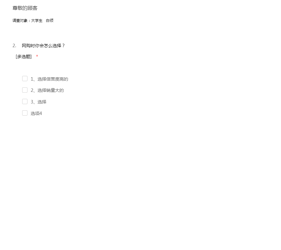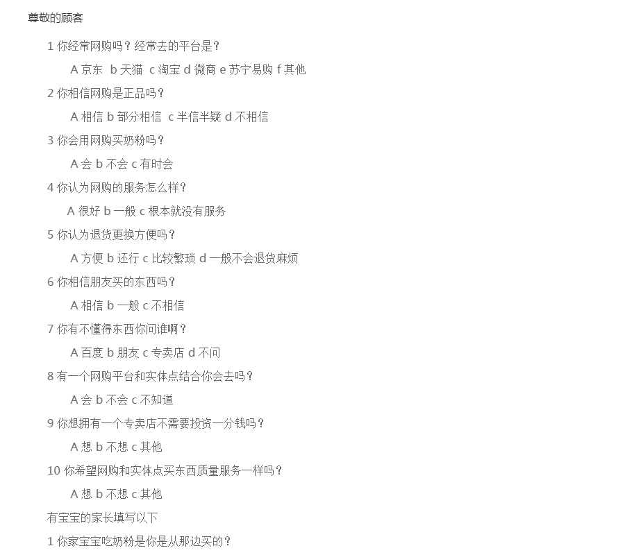 1 你经常网购吗?经常去的平台是? A 京东 b 天猫 c 淘宝 d 微商 e 苏宁易购 f 其他 2 你相信网购是正品吗? A 相信 b 部分相信 c 半信半疑 d 不相信 3 你会用网购买奶粉吗? A 会 b 不会 c 有时会 4 你认为网购的服务怎么样? A 很好 b 一般 c 根本就没有服务 5 你认为退货更换方便吗? A 方便 b 还行 c 比较繁琐 d 一般不会退货麻烦 6 你相信朋友买的东西吗? A 相信 b 一般 c 不相信 7 你有不懂得东西你问谁啊? A 百度 b 朋友 c 专卖店 d 不问 8 有一个网购平台和实体点结合你会去吗? A 会 b 不会 c 不知道 9 你想拥有一个专卖店不需要投资一分钱吗? A 想 b 不想 c 其他 10 你希望网购和实体点买东西质量服务一样吗? A 想 b 不想 c 其他 有宝宝的家长填写以下 1 你家宝宝吃奶粉是你是从那边买的? A 网购 b 朋友介绍 c 专卖店购买 d 超市购买 e 其他 2 对奶粉不了解你会询问谁啊? A 朋友 b 专卖店 c 百度 d 网店 e 其他 3 对于奶粉你更信任谁? A 网购 b 朋友 c 专卖店 d 厂家。 4 你认为奶粉的性价比哪种更高? A 网购 b 朋友介绍 c 专卖店 d 其他 5 在家看宝宝时你是工作还是无业? A 工作 b 无业 c 兼职 d 其他 6 看宝宝期间想找个工作吗?在不误看宝宝的前提下。 A 想 b 不想 c 其他 7 在不误看宝宝的前提下有工作你会做吗? A 会 b 不会 c 其他