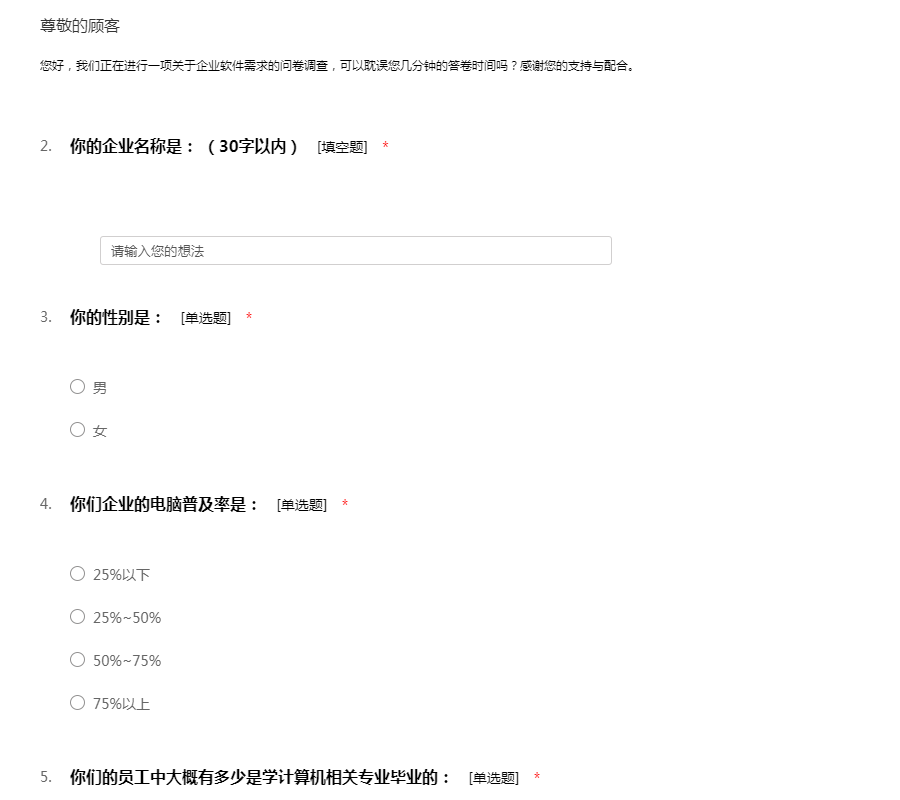 您好,我们正在进行一项关于企业软件需求的问卷调查,可以耽误您几分钟的答卷时间吗?感谢您的支持与配合。